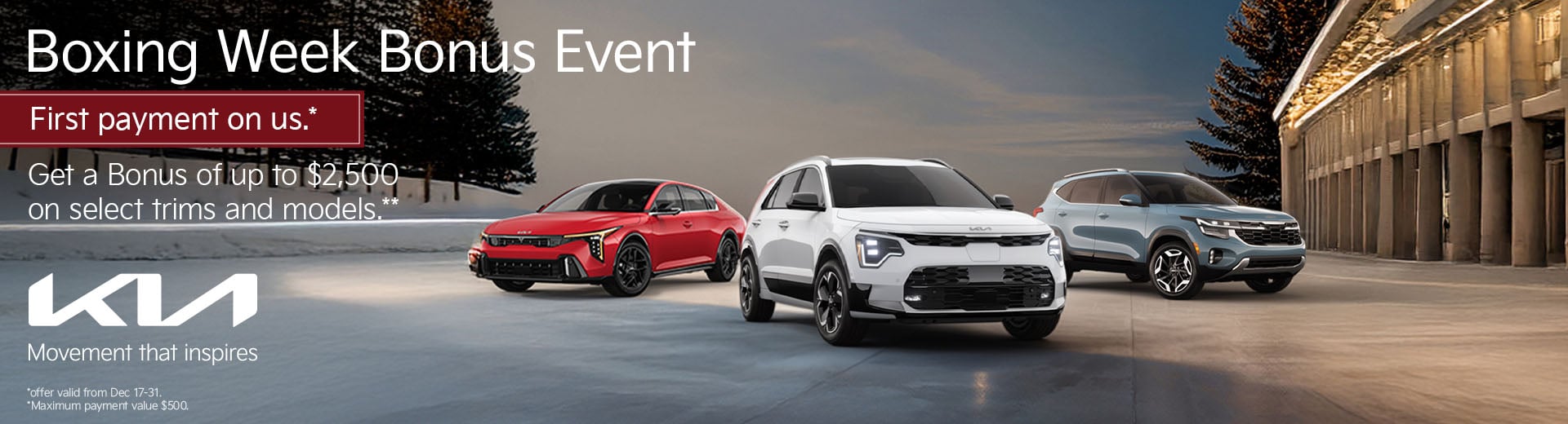 OMVIC Licensed. Vehicles may not be exactly as shown (and/or) Vehicles are for illustrative purposes only. All vehicles were available at time of print/publication. Advertised offer up to $2,500 bonus applies only to new and previously unregistered select 2025 Niro EV trims that are financed or leased through Kia Finance (on approved credit). Advertised offer of First payment on us available for new vehicle purchases up to $500 value. See dealer for details. Offer valid from December 17th to 31st, 2025.